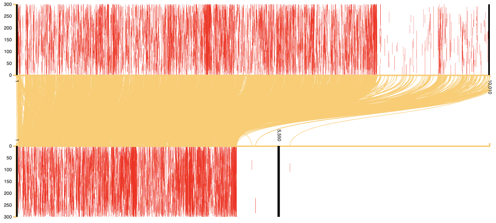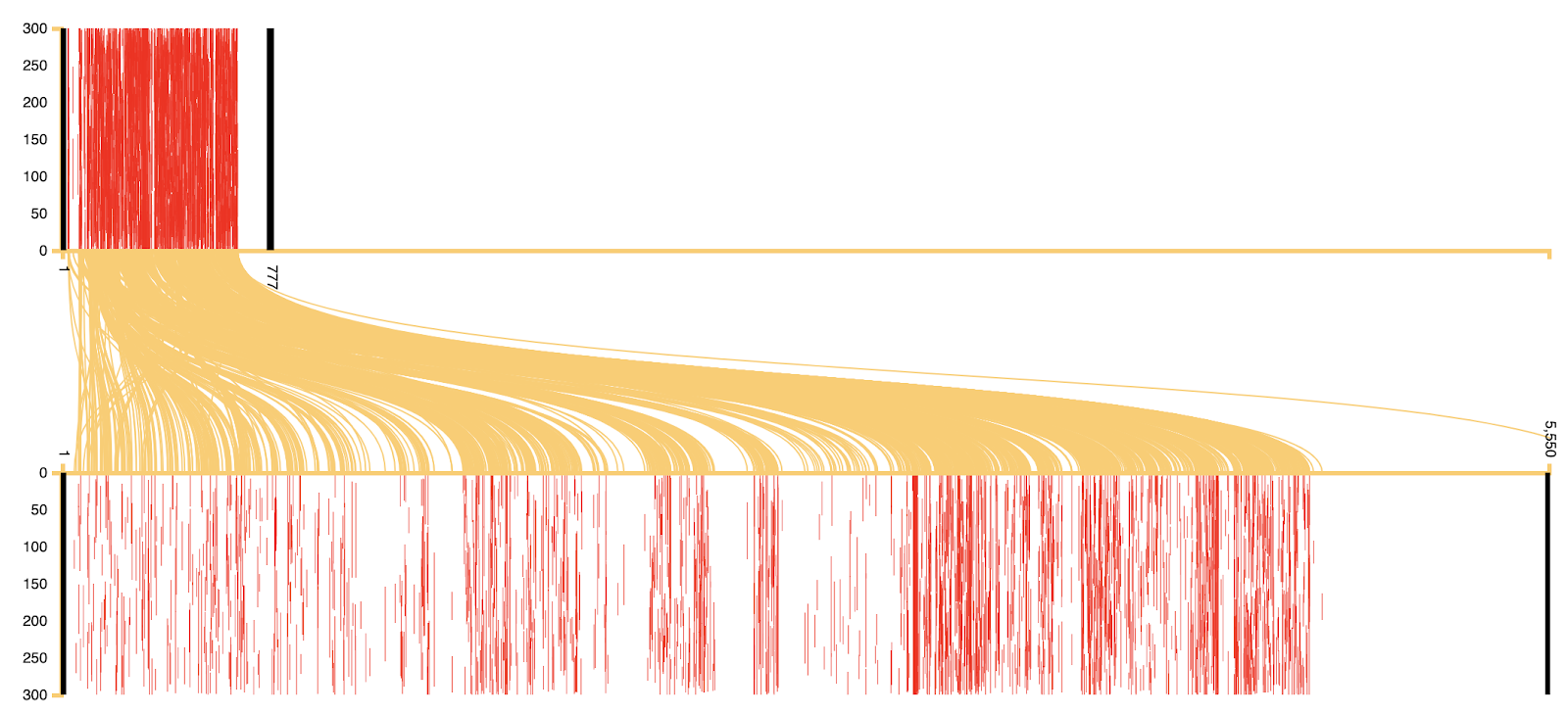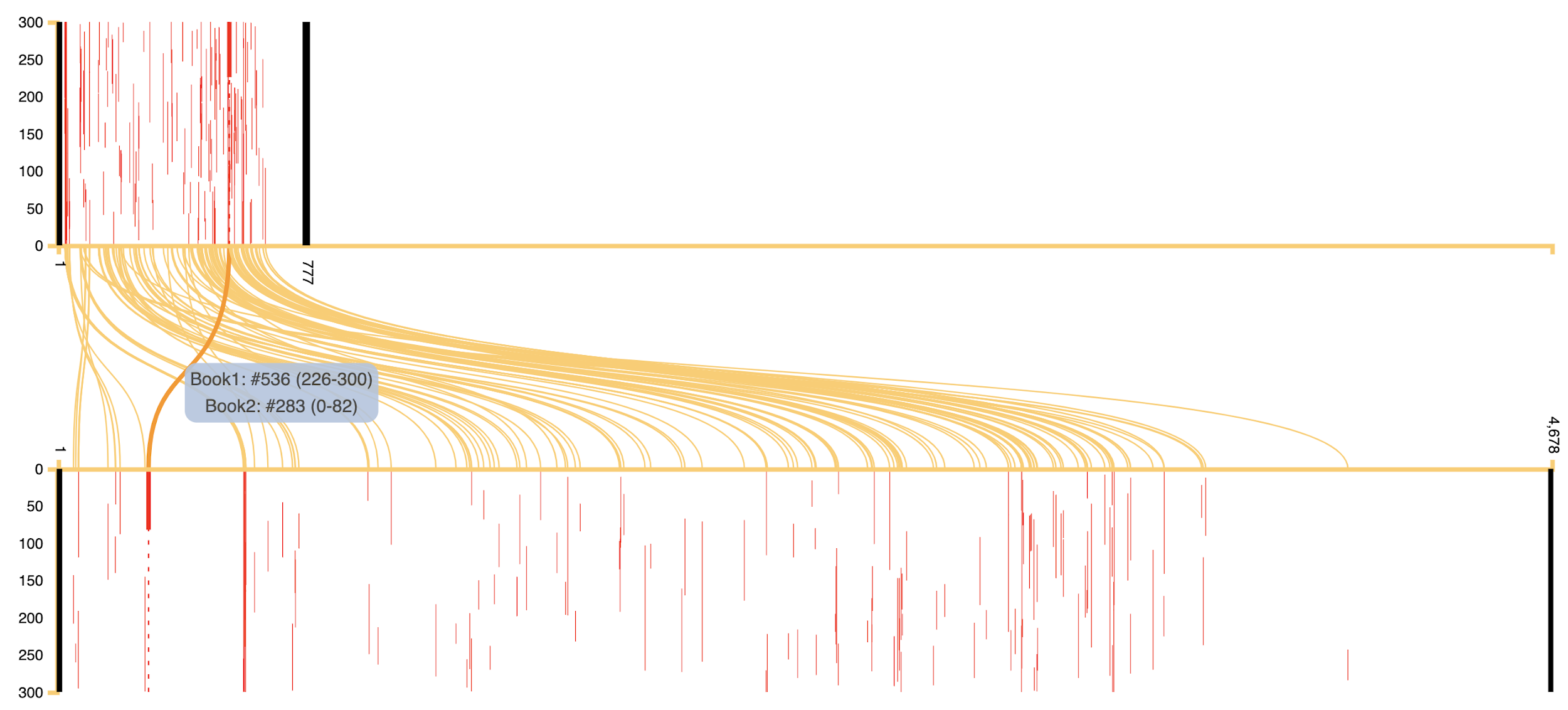 The first example is a comparison between the Daʿaʾim and the Kitab al-Kafi of al-Kulayni (d. 329/941), the first canonical Imami Shiʿi Hadith collection. Both works were compiled roughly around the same time, in Kairouan (modern Tunisia) and Baghdad, respectively, so it is most likely that the authors did not have direct access to each other’s books. However, because both works were drawing on many common Shiʿi sources and early Hadith collections, the algorithmic reading of the texts yields a significant number of alignments. The figure below visualises 152 common passages detected by passim. Here, the width of the red lines indicates the length of the reused text in each of the books. Typically, unless a book has been directly reused, the number of paired alignments will be few and one will not be able to get a quick idea about the nature of the relationship between the texts. This is what happens when we compare the Daʿaʾim with the earliest Hadith collections. However, when we compare it with comprehensive compendia such as the Kafi, we get an instant sense of the structure of the texts.