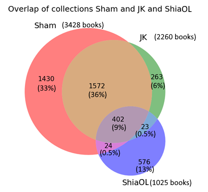 In order to get a better idea of the bias in the content of the Shamela collection, it is instructive to compare the books in the three largest collections. 4290 out of the 5104 distinct works in OpenITI release 2021.1.4 come from the three main source collections (Shamela, al-Jamiʿ al-Kabir (JK) and Shia Online Library (ShiaOL)). These three collections overlap to a significant extent (see Figure 2).