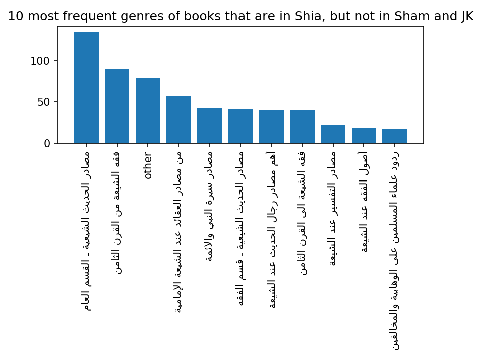 While only a small number of books, less than 10 percent of the 4290 unique works, are represented in all three collections, almost half of the books are represented in more than one collection. The books that are unique to each collection can reveal the bias of each collection. The ShiaOnlineLibrary collection (marked as ShiaOL in Figure 2) has the largest number of unique books, relative to its size: 56% of its books are not present in the other two large collections. An analysis of the most common subject tags attached to these books unique to the ShiaOL collection shows, unsurprisingly, that most of these books have a specific Shiʿi subject. Eight of the 10 most frequent genres of books in the Shia collection explicitly have ‘shiʿi’ in their names; the other two contain ‘sources for the life of the Prophet and the imams’, and ‘Replies of Muslim scholars to Wahhabis and [other] opponents’: