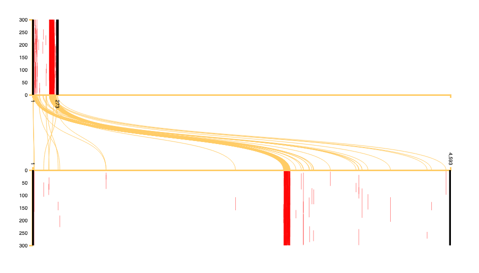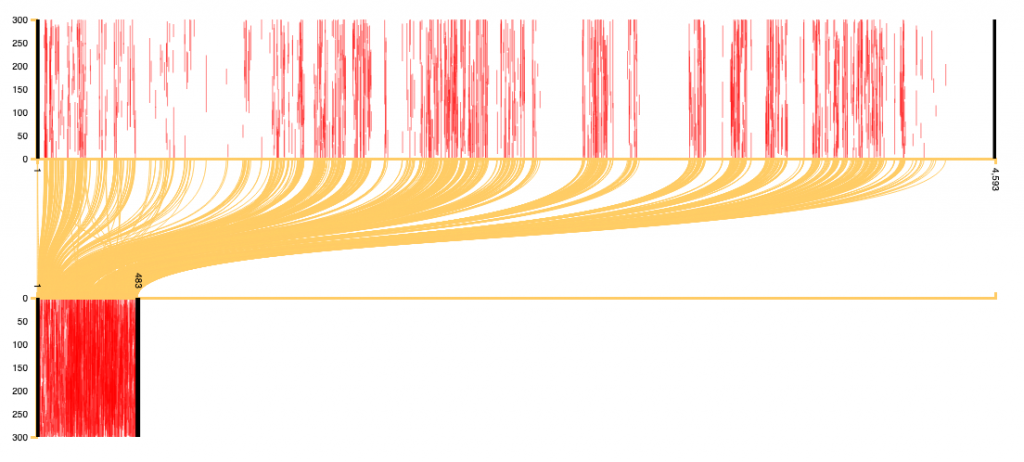 Image 1: The top of the graph represents the digital version of al-Jahiz’s al-Risala al-ʿuthmaniyya, the bottom the digital version of Ibn Abi al-Hadid’s Sharh Nahj al-balagha. Red lines denote the chunks of text shared between the two texts, while the yellow lines show their positions within the works.