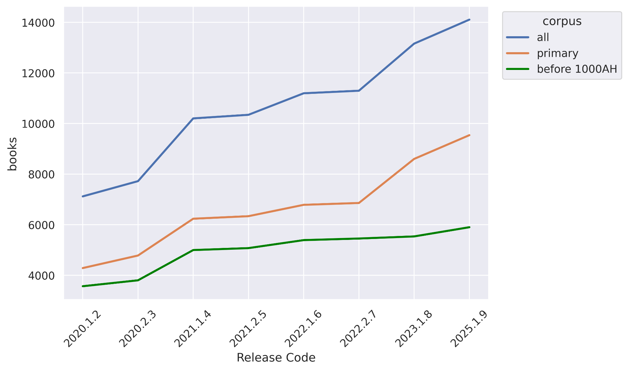 This release includes 9,106 unique books authored by 3,618 authors. When all available versions are taken into account, the corpus now consists of 14,107 text files. The complete collection—comprising books and manuscripts in multiple languages—contains a total of 2,348,893,857 words. Below is an overview of the subcorpora: