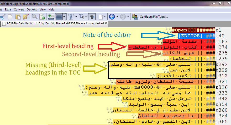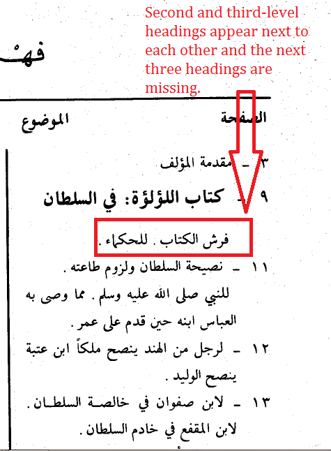 To briefly review the annotating of a text and some of the routine difficulties it involves, let’s have a glance at tagging the first few pages of a typical text in our corpus. Fortunately, the edition of the text in question – the ʿIqd al-farid by the author/compiler Ibn ʿAbd Rabbih (d. 328/940) – is both of high quality and accessible online (when it is not possible to find the same edition, annotators can use a different edition for collation; however, this needs to be done with care since two editions of the same text may well have a lot of differences). Although at this stage of preparing the text it is necessary to tag only the structural elements, this process presents its own difficulties and is not as simple as it might seem. For example, in most cases, annotators cannot rely on the books’ table of contents (TOC). This is partly because some structural elements (such as individual biographies) do not appear in the TOC. It is also because many published books do not have a TOC. Even when one is included, it may be practically useless for annotation. For example, a comparison of the book’s TOC and the human-annotated digital text in Figures 1 and 2, respectively, makes it clear that some of the headings in the text are missing in the book’s TOC. Moreover, the book’s TOC does not accurately reflect the way in which headings and subheadings are nested within the book itself. The heading titles are all presented as if they were parallel (except Kitab al-Luʾluʾa, which is set in bold), even though some of them are obviously subordinated to others. In addition, some empty header tags should ideally be added to make the structure coherent. As is evident from Figure 3, the author jumps to mentioning the holy wars (ghazawat) of one of the Umayyad caliphs in Andalusia without any heading specifying this shift.