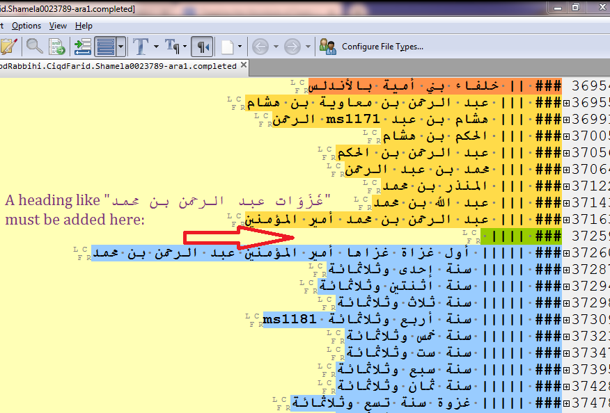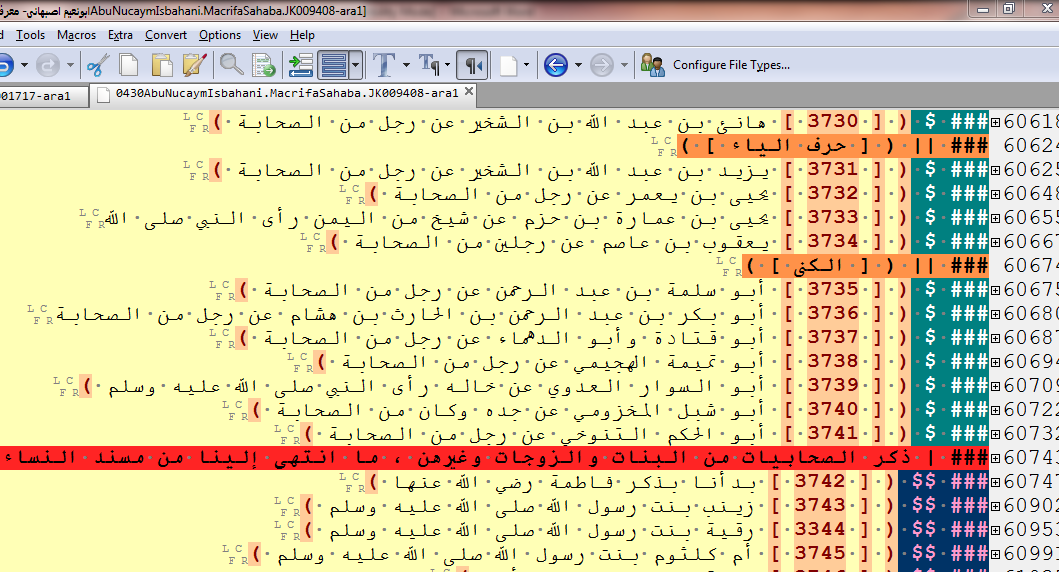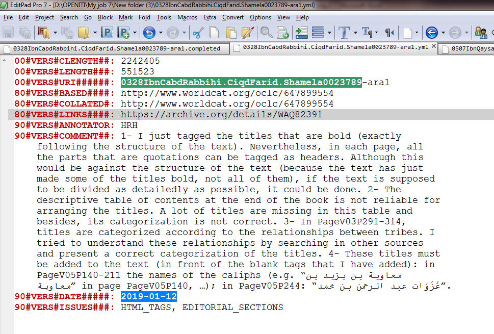 The KITAB project relies on this corpus in its work on text reuse detection (through which the project aims to discover relationships among texts by aligning those parts of them that share common wording). In the project’s workflow, a first step is manual tagging of the structural elements of the texts (headings and subheadings or, for example, the names that order biographical dictionaries). For a complete description of the tags, click here. To annotate the texts, we use EditPad Pro, a powerful text editor that supports Arabic and can easily handle large texts. Annotators start by collating each machine-readable file with a printed version of the text (ideally using a PDF from the internet, but alternatively, the physical object in a library).