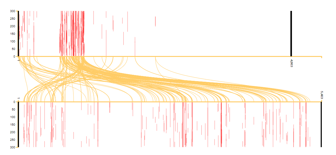 This visualisation layers many types of data. Put simply, it represents each of the two works as a scroll laid on its side, with the top on the left, the bottom on the right and each line containing 300 words (marked on the y-axis). Along the x-axis, each work is divided into milestones (on text reuse and milestones, see our explanation of the passim algorithm). Thus, the top graph in image 1 shows Ibn Taghribirdi’s (d. 1470) Nujum, and 1 represents the first milestone in the book while 3,745 represents the last milestone. The bottom graph in image 1 shows Ibn al-Athir’s (d. 1234) Kamil; 1 is the first milestone in the book and 4,500 is the last.