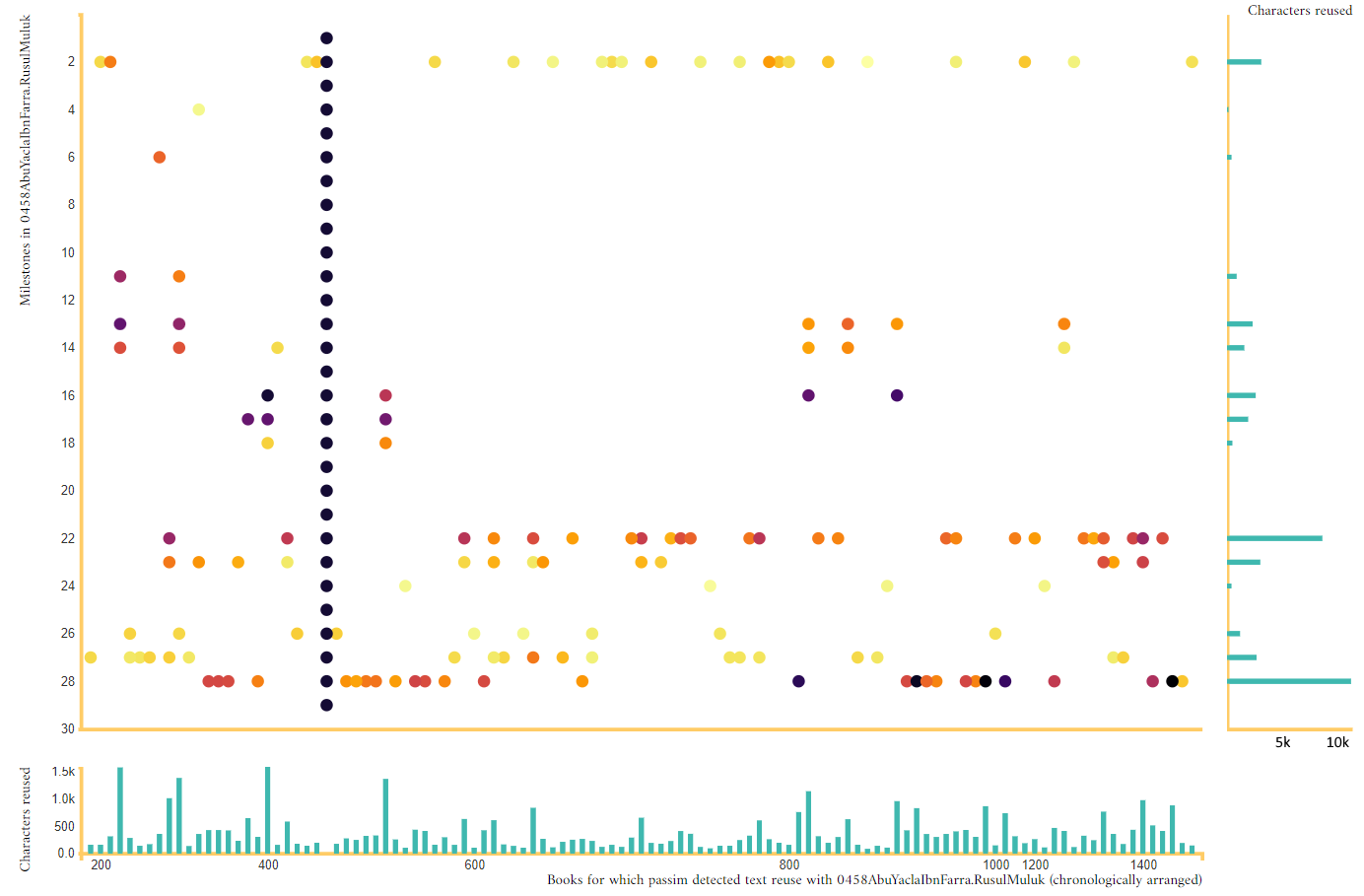 All other texts in the corpus in which passim), our text reuse detection tool, found shared passages are depicted in chronological order on the X axis: the earlier texts on the left and the later texts on the right. For each milestone in the corpus that has a shared passage with the main text, we put a dot on the location corresponding to the position of this book on the X axis and the position of the milestone in the main text (Y axis). The colour of the dot represents the intensity of the text reuse between the two milestones: the number of characters of the milestone in the main text that are covered by the text reuse alignment with the milestone in the other book.
