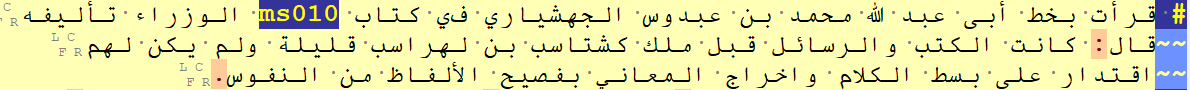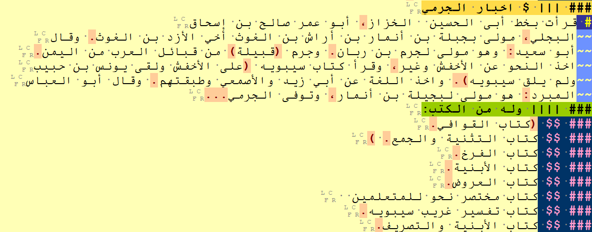 | Figure1: Sample of the tagged Fihrist text: the biography of al-Jarmi with the list of his books (from the first subsection (fann) of the second chapter (maqala) of the Fihrist). The section on al-Jarmi### | has been tagged as a third-level section header (three pipes after the ### tag), because it is an immediate subsection of the fann. The colours are generated by the OpenITI mARkdown highlighting scheme in EditPad Pro. |