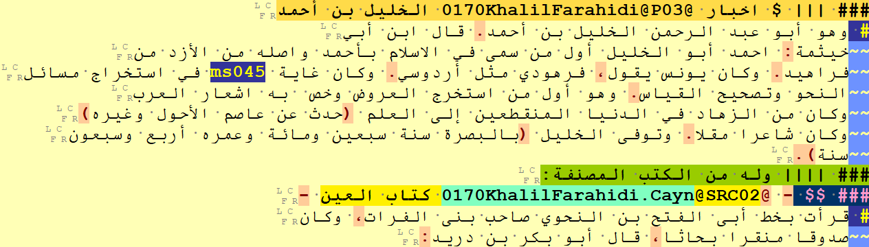 Figure 4: author’s name and book title tagged with OpenITI URIs. The tag `@P03` means “the following 3 tokens are the name of a Person (and that name is preceded by 0 prefix characters)”. Similarly, `@SRC02` means that the following 2 tokens are the title of a book (preceded by 0 prefix characters). Note that the OpenITI highlighting scheme in EditPad Pro highlights the tagged titles in yellow and book URIs in mint green. The highlighting of the author URI and name is not visible here because the section title highlighting is covering them.