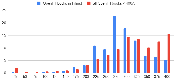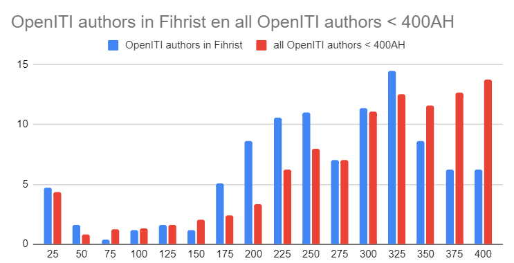 Breaking these numbers down along chronological lines, it became clear that the Fihrist contained much fewer OpenITI books and authors from Ibn al-Nadim’s lifetime than one would expect. The reason for this cannot be established based on the available data (without trying to date all books and authors in the Fihrist, instead of only those that are part of the OpenITI corpus); one possible interpretation is that Ibn al-Nadim has a preference for dead authors; another that authors who died a century or more before Ibn al-Nadim and still made it into the Fihrist, had more chance to survive until today than his contemporaries. Finally, the Fihrist itself may have played a role in deciding which books were preserved: the work was a major source for later bibliographical works, and these bibliographical works have certainly been used by book collectors to decide which books to acquire.