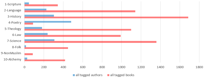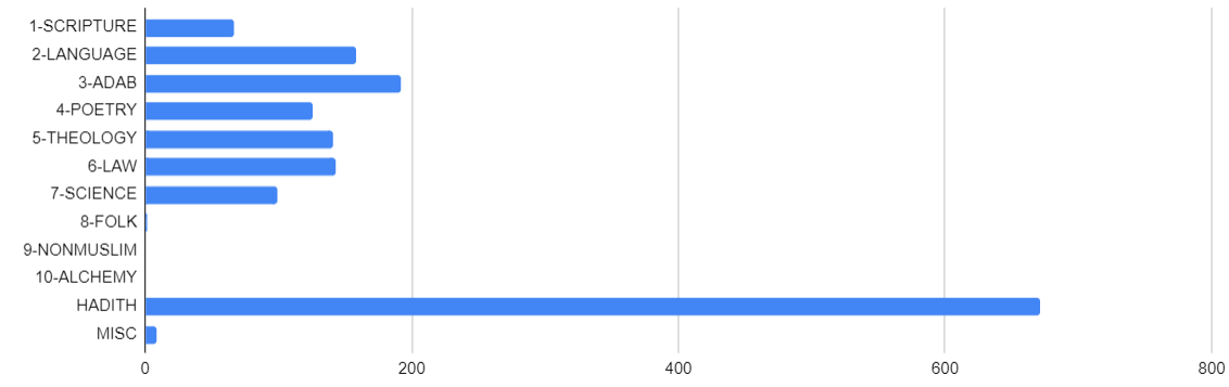Figure 6: pre-400 AH books in the OpenITI corpus, by topic tag. The first 10 tags agree with the Fihrist’s chapters, the other tags were created for books that did not fit into these categories easily.