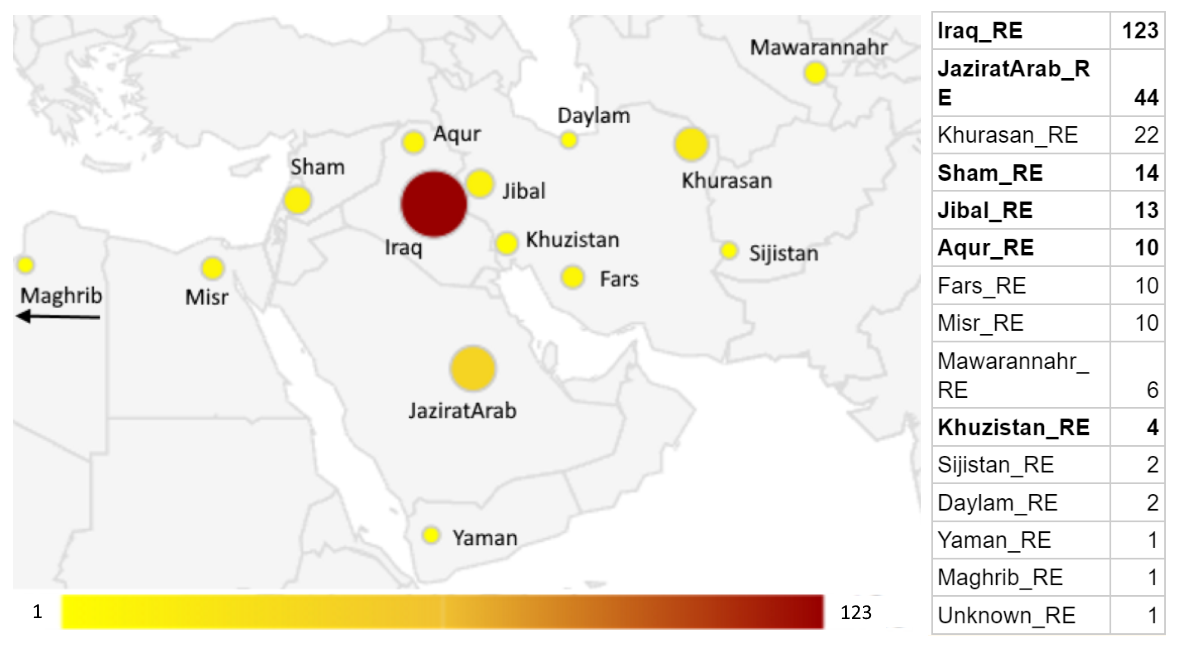 Figure 8: regional distribution of the authors that feature both in the OpenITI and the Fihrist. In bold: Iraq and neighbouring regions.