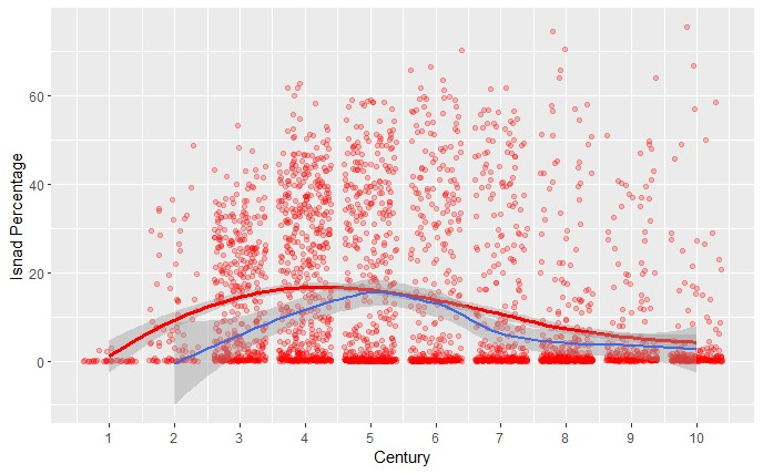 Figure 1.1: Isnāds as a percentage of historical works, 0–1000 AH, based on an ‘isnād classifier’ created by Ryan Muther. Each of the dots represents a book within the OpenITI corpus, plotted using the programming language R. The x-axis marks the century in which the author died, and the y-axis shows the percentage of the work that consists of isnāds (its ‘isnād percentage’), calculated by dividing the number of word tokens in the entire text by the number of word tokens located within isnāds. The red line represents the median isnād fraction for the middle two quartiles of each century. The blue line represents a filtered subset of the same data (similarly calculated) for works specifically classified as belonging to the genre of history (‘Geschichte’) by Carl Brockelmann.10