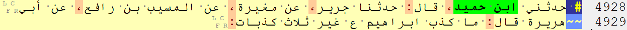 | ms0185 | حدثني ابن حميد قال حدثنا جرير عن مغيرة عن المسيب بن رافع عن أبي هريرة قال ما كذب ابراهيم ع غير ثلاث كذبات | Muhammad b. Humayd al-Razi | Jarir | Mughira | al-Musayyib b. Rafi' | Abu Hurayra | Taʾrikh | 6 |