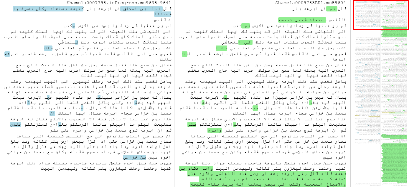 Image 1. An excerpt from a longer alignment (displayed furthest to the right, with the excerpt circled in red) between passages based on Ibn Ishaq’s Sira in al-Tabari’s Taʾrikh (on the right; OpenITI, Shamela0009783, milestones 596–604) and in his Tafsir (on the left; OpenITI, Shamela0007798, milestones 9635–41). Text found only in the Taʾrikh is highlighted in green; text found only in the Tafsir is highlighted in blue. The long green block comes from Hisham b. Muhammad al-Kalbi. Alignment generated with Ryan Muther’s adaptation of David Smith’s passim software and fed into the OpenITI Diff viewer application (created by Peter Verkinderen, who also designed the way to visualise the location of the excerpt within the whole).